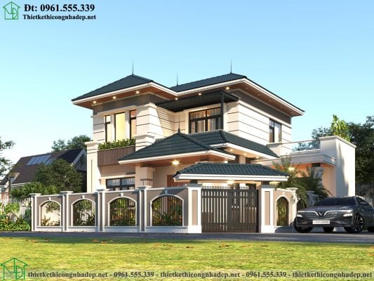 Mẫu biệt thự 2 tầng mái Nhật toát lên vẻ thanh thoát và nổi bật với hệ mái Nhật tựa như một chiếc ô lớn bảo vệ cho không gian nhà. Hệ mái Nhật được thiết kế với độ dốc vừa phải sau đó đổ bê tông và dán những viên ngói chồng lên nhau một cách đẹp mắt. Bên cạnh hệ mái Nhật, khoảng sân vườn rộng rãi và thông thoáng được quy hoạch một cách khoa học, hệ thống cây xanh và tiểu cảnh ở các góc sân mang đến không gian nghỉ dưỡng tuyệt vời cho các thành viên trong gia đình.